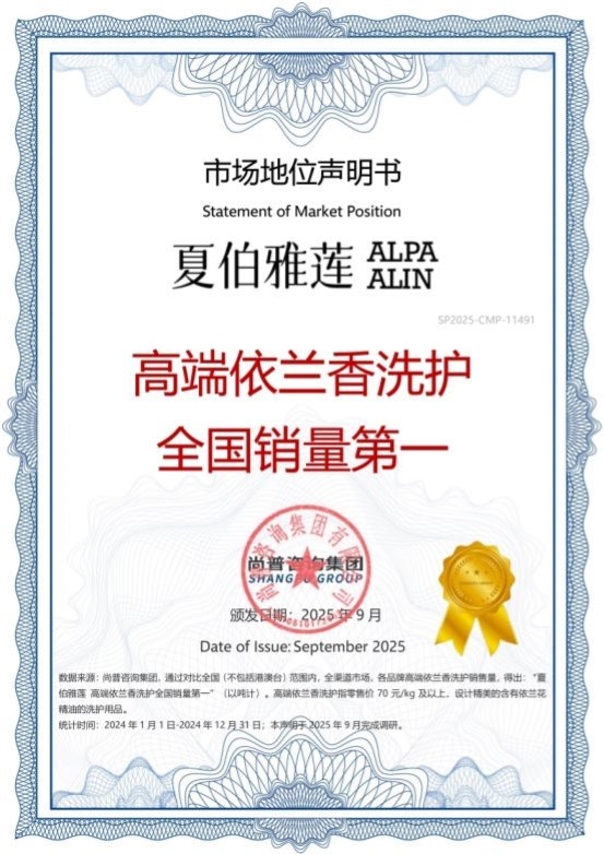 2025年9月,尚普咨詢集團(tuán)向夏伯雅蓮頒發(fā)市場地位聲明書。此次夏伯雅蓮榮獲尚普咨詢【夏伯雅蓮高端依蘭香洗護(hù)全國銷量第一】市場地位聲明,這一成績不僅彰顯了夏伯雅蓮在行業(yè)內(nèi)的卓越地位,也為中國高端依蘭香洗護(hù)市場的發(fā)展注入了強(qiáng)大動(dòng)力。
